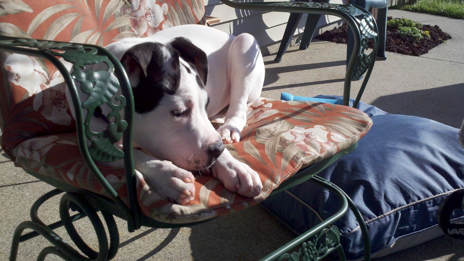 Ray being a December baby has not been typically excited about spending much time outside until lately but we try to be outside as much as possible when the weather permits. These past two weekends have really been enjoyable for him as I’ve noticed a new reluctance to come inside. Since we spend so much time on the patio I wanted to find a nice cushion for Ray as well so that I could have him nearby without having him lie on the concrete. I actually scored big time with a weatherproof cushion that I found at WM for under $30. It’s even big enough and strong enough that he’ll be able to use it for many years (I hope.)