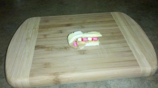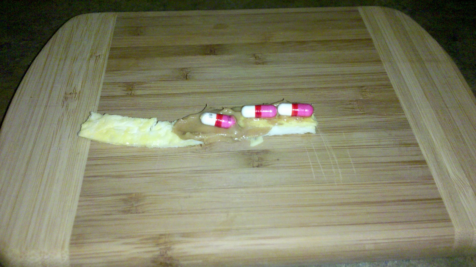 On a scrambled egg and peanut butter sushi roll up, of course! These were the small capsules, 25 mg each, but you’d have thought it was the best treat ever. I guess if you’re Ray-Ray, it was.