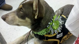 On Saturday, I was handling Zoey who is the cutest, sweetest, most well-behaved 4 month old I’ve ever met. This lime green and zebra print went perfectly with her cinnamon coat and amber eyes. I’ve handled Honor on another occasion and was disconcerted by the number of people who mistook her for a boy, so Saturday she sported a lavendar band and flower.