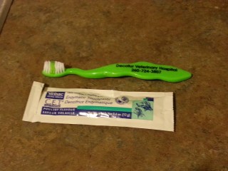 5. We brush teeth but only about once a month, so not nearly enough. They do okay, but they try and lick the whole time so that makes it tough.