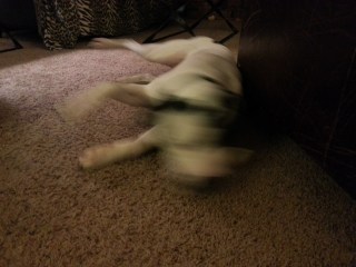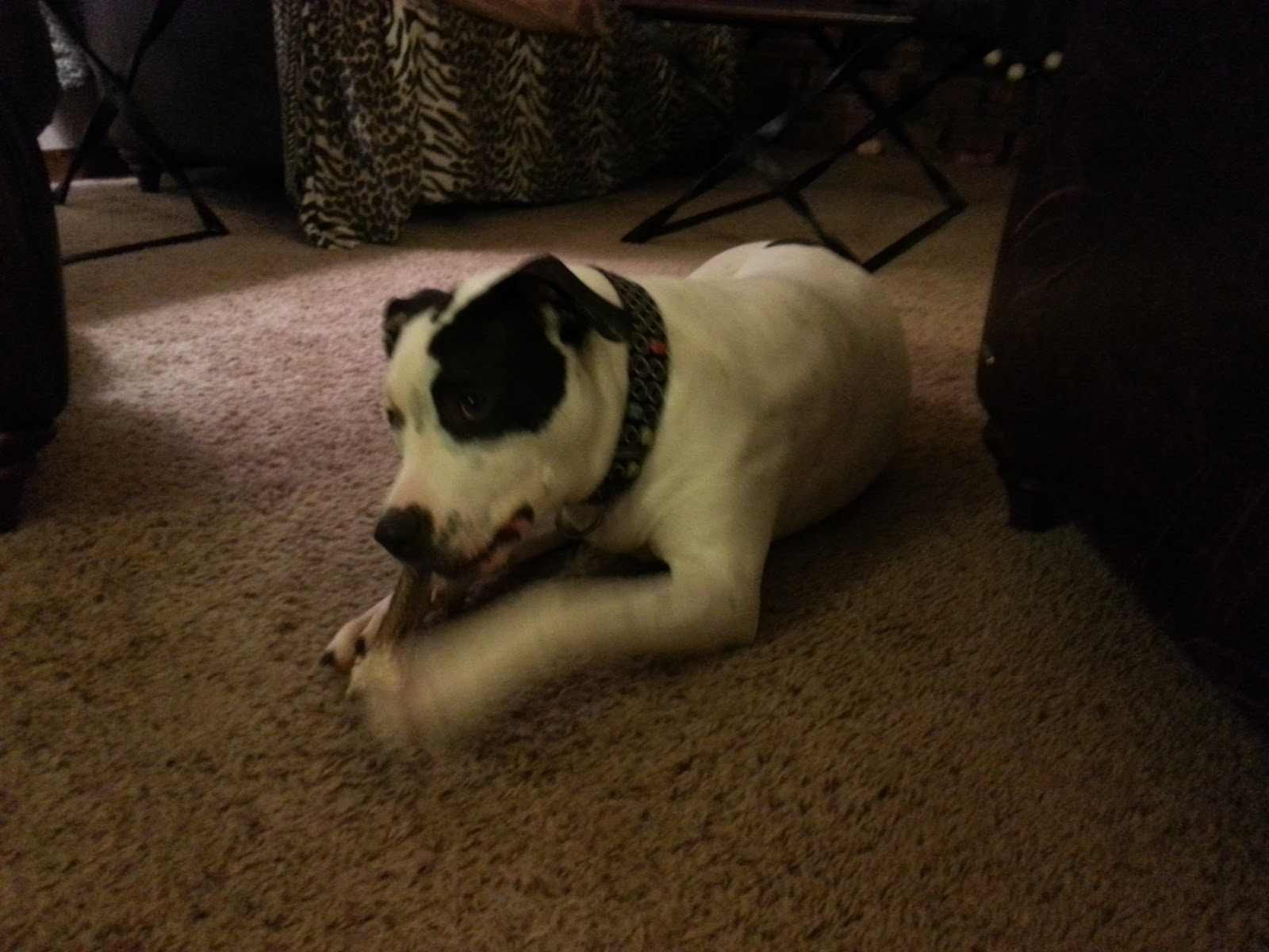 Antlers are something that Ray is very mezzo-mezzo about. He prefers the split elk antlers but right now only has his deer antlers, one with a large nub and one more tapered. Because that is what we have available right now, he has been chewing on those more lately.