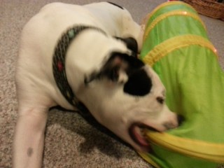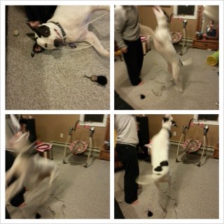 Although the kitties like to “play string,” how much fun is it for an 80 pound puppy to fly through the air to catch the end of a string?