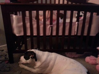 Ray and I ended up babysitting and I have to say, that Ray is becoming quite the responsible young man. We’ve kept the intros extremely brief for a very long time since Ray was such an exuberant puppy. Ray still doesn’t have free run of the house and actually when I took this picture on Monday, this was the first time he was allowed in the nursery. The baby luuurves herself some Ray-Ray (who doesn’t?) and Ray loves the baby, but we do keep it brief and calm.
