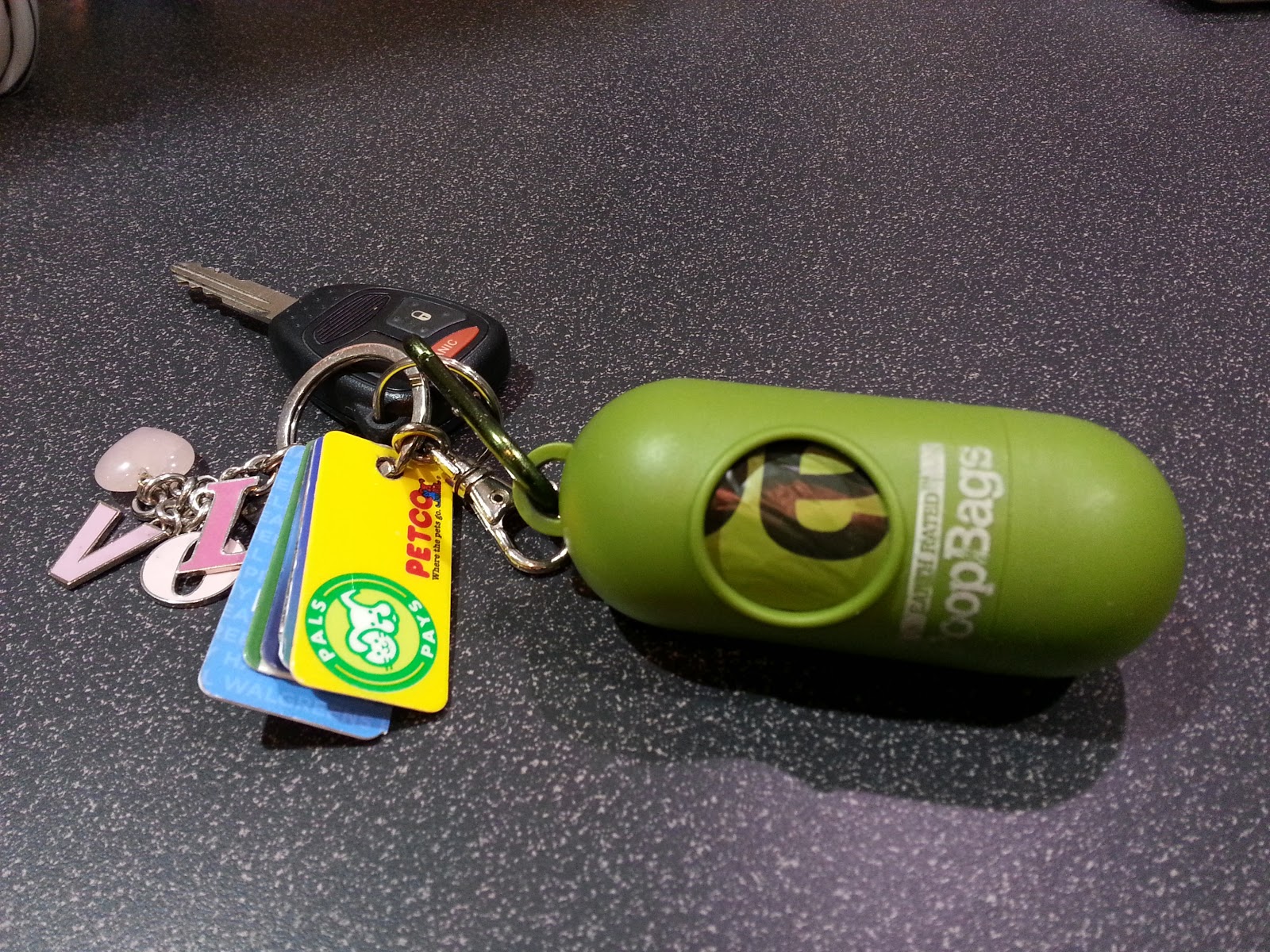 I have stuffed mine in my bra before but now I carry a little doggie pouch I sling over my shoulder. It feels dorky but oh well. I like the keychain!