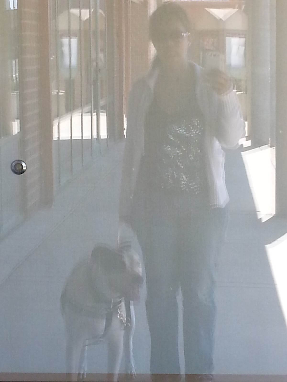 You would think that was enough excitement for one Ray-Ray but Mama had more planned.  We went to see Daddy at work and I met one of Daddy’s co-workers.  This guy was nervous to meet me, but after I said Hi to him so nicely and he petted me, he decided that he was ridiculous not scared.  Mama and I even took another short walk so I could show off get used to my new harness.  She only got a picture of us in a window but you can see just how incredibly handsome good I was.