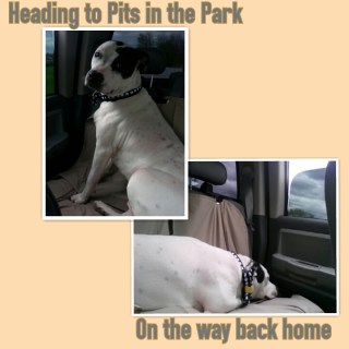 On Sunday, Ray got all spiffed up, so he was pretty sure something fun was in store, and he was right! We attended the 2nd Annual Pits in the Park. It’s great to see an event like this in a community which seems slower than some to accept Pit Bull type dogs in the mainstream. I loved chatting with some friends, old and new and regret that I didn’t get to meet up with others, but there will be other opportunities, I’m sure. Ray only had one meltdown and of course it had to be while we were chatting with his trainer from puppy class and the director of the SPCA. Nice. I should have seen it coming, though. I brought Ray’s water bowl and bottled water but had left them in the truck and he was thirsty. I knew he was thirsty and I kept putting him off, made all the worse by the fact that we were standing by a large pool/fountain thing. Of course we had to maneuver through the crowds and go all the way back to the truck, because His Highness won’t drink from community water bowls.