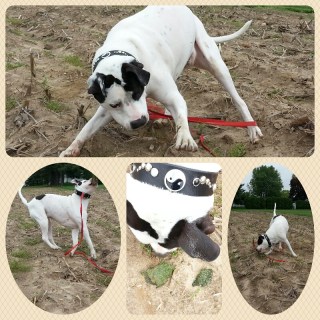 My parents live “out in the country” and I brought Ray’s extra long leash so that he could explore and sniff as much as he wanted, within reason. My parents live on a full acre, part of which they are re-landscaping so there were piles of yard scraps around. They also live bordering on corn fields which haven’t been tilled? planted? yet so Ray got to sniff, dig and rip corn stalks to his heart’s delight.
