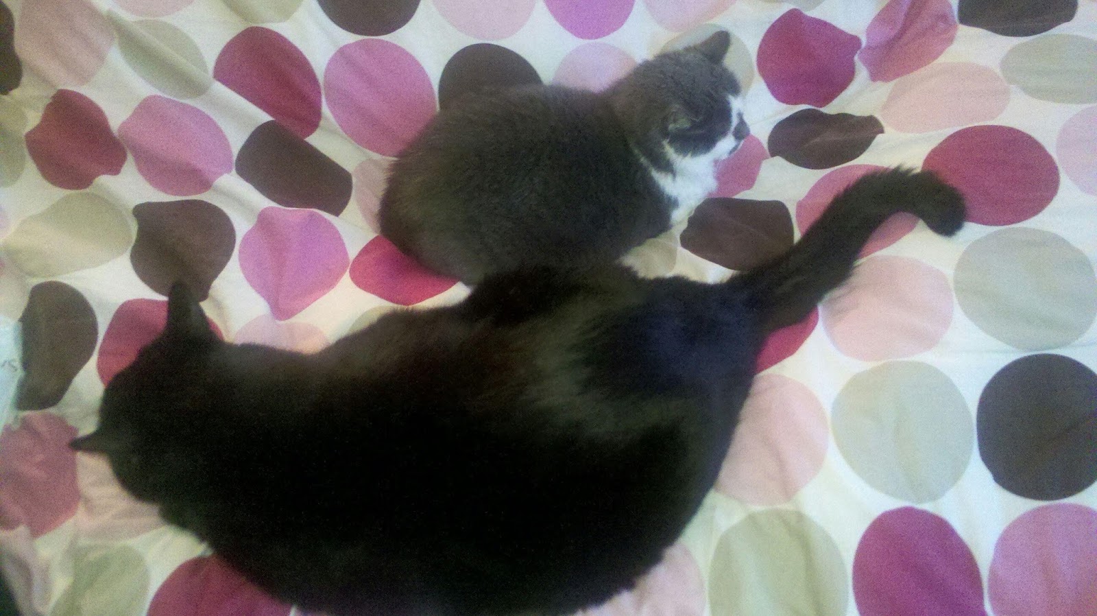 Jae spends most of his time on top of hte table that Ray sleeps under.  He is the one who walks anywhere he wants, drinks from dips his piggies in Ray’s water bowl, and steals kibble.  They can pass each other in the hallway without so much as a “how ya doin'” to each other because Jae has learned that a moving cat is FUN to chase and a stationary cat isn’t even worth the effort of nodding to.