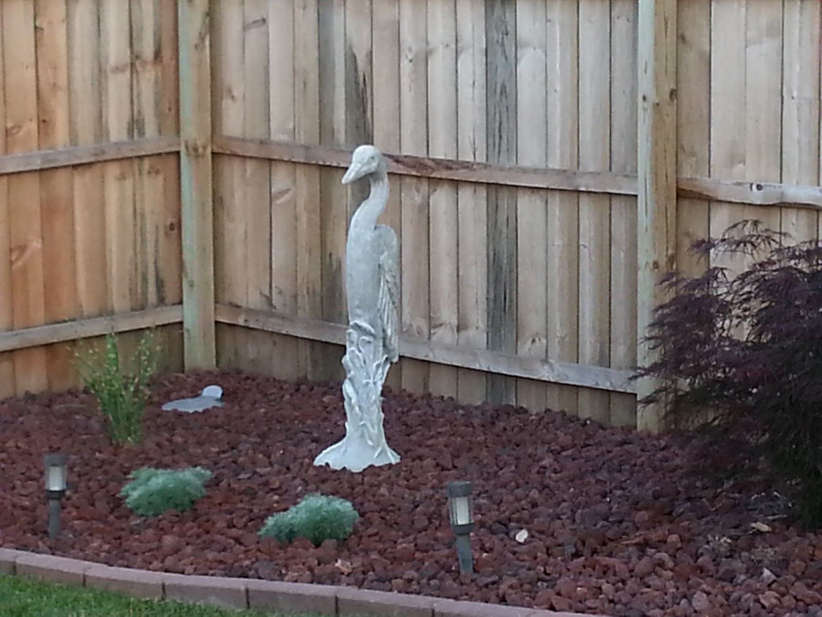 Last weekend we found this great crane statue to fill some space in our corner. We originally had the lava rock ending just past this Japanese Maple but with the addition of something that I really, really wanted to add to our yard, we finished off this corner.