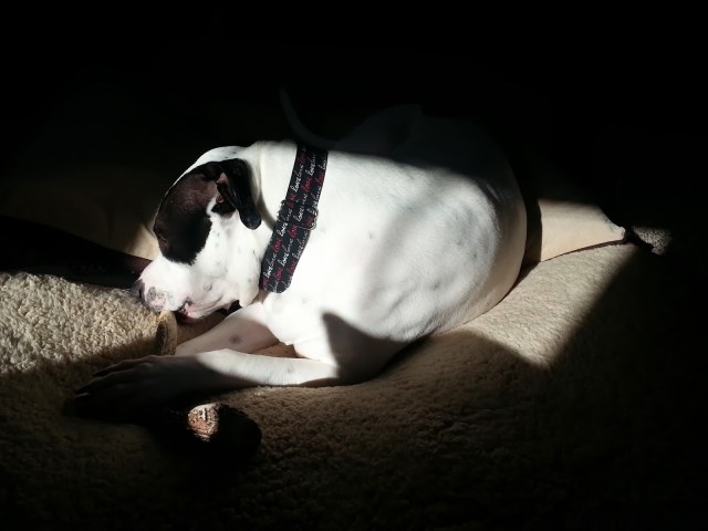 Last week, however, the limping got worse and I was able to get an appointment with the Veterinarian who has a better relationship with Ray and who also owns a Pit bull mix. She is patient and caring and aware of any stigma that may stem from a frightened Bully type dog. I must say, our doctor spent nearly an hour and a half with us, watching Ray walk, sit and interact. She worked on getting him comfortable enough for a manual evaluation but at the end of the day, we came away with a diagnosis of a suspected torn ACL. The muscle in Ray’s leg and Ray’s anxiety did not allow for a completely thorough exam. I was left in the exam room while the staff checked him out and the sound of his terrified screaming and moaning will haunt me forever. I’m glad I left my phone in the car, because I may have been tempted to record that sound and really, no one should ever hear that sound.