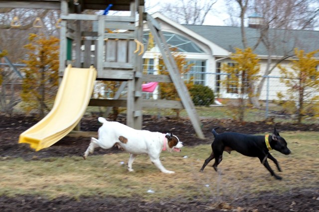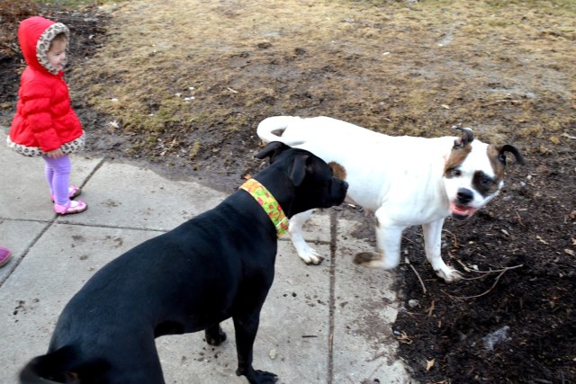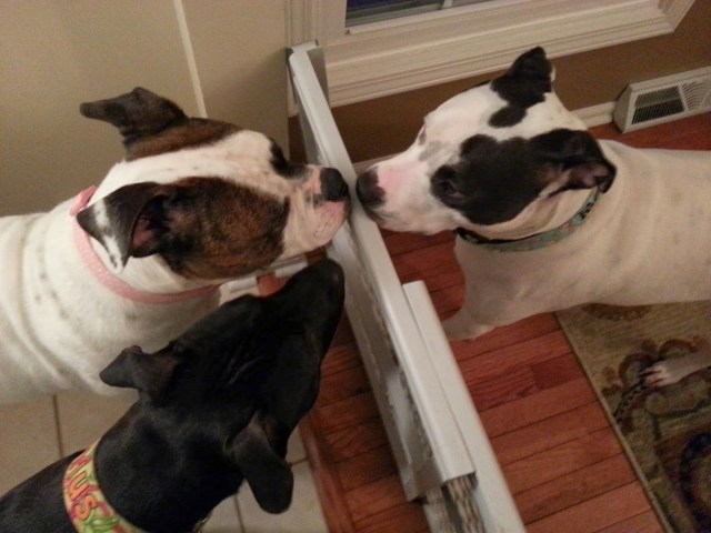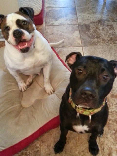 Satisfied that the Pitty Van would survive the boundless joy of these two, we loaded them up and I headed for home where Asia was already preparing the house with gates and closing Ray off for a while before any introductions could occur. Julius and Tora bounced about the yard and after a bit we decided to do some brief intros with Ray. I put Julius in the garage for a while and Asia and I did some leashed brief meets with the two American Bulldogs. Ray, who has way fewer social skills, seemed eager to meet this buxom beauty, but was somewhat over stimulated (though not nearly to previous degrees) and he did snap at her a couple of times. Tora, in her eternally sunny manner, just ignored Ray’s rudeness. We decided to let Ray decompress for awhile upstairs and after about an hour, he was happy to be downstairs with the rest of us, though behind a gate.