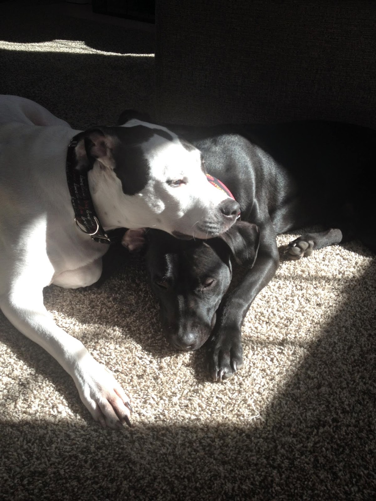 To say Ray was a challenge as a puppy would be to say that Chicago can be a bit breezy.  Ray and his litter mates were separated from Sparkles at around 5-6 weeks and really had no social skills.  While my mission was to socialize Ray as much as I could, I also found myself disinclined to do so.  My ambassabull was so prone to leaping up from his diminutive stature and ripping the fabric from my sleeves.  He “mouthed” my hands, passing feet, toys, furniture, leashes, and anything else he could find.  I was the redirect queen, with antlers, chew bones and stuffies shoved into every pocket but there were plenty mornings where I sat on the kitchen floor and cried bawled, “Oh my god!  Pit bulls live for nearly 17 years!  I have to endure 16 and a half more years of this!”