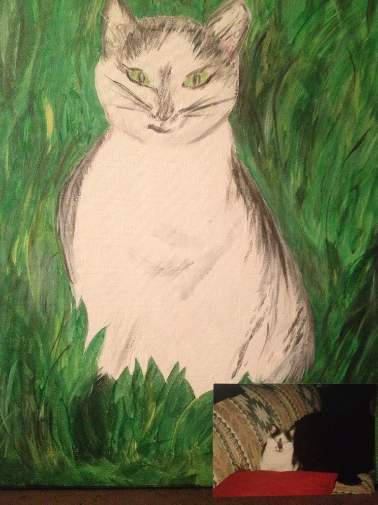 I stared at the blank canvas for what felt like eons, took a deep breath, and dove in. I’m certainly no artist, but I’d be lying if I didn’t confess to being pleased with the result which is meant to be a combination of the photo at the bottom and another photo I have of her in a tree.