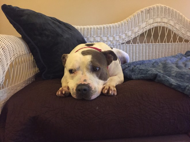 Life is pretty good for me now, but my Foster Mama says I’m in a “holding pattern” and that this isn’t actually my home, although it seems pretty darned good to me. It’s definitely better than where I was. This whole year has been full of changes for me and it took a long time before I felt like this place was going to work out. I was in “the shelter” and then I went to several different homes but kept getting returned just for being me and it was making me sad, but Foster Mama says I’m now at the Peaceabull place for a while and I can decompress, whatever that means.