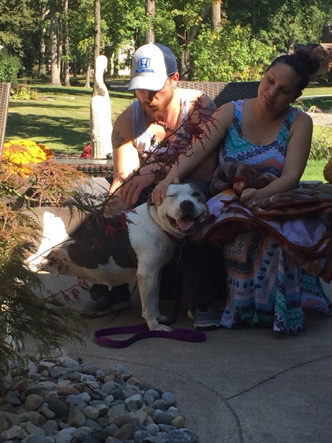 But then a while later the nice lady who volunteers at The Shelter took me to the Vet and left me there and Foster Mama picked me up and brought me here to the Peaceabull place. I didn’t really know what was going on at first and I wanted to be with Foster Mama and Foster Daddy and I wanted to chase that mean fat cat and hang out with those handsome boy dogs who live behind the gate. I did sneak out and see that big handsome Julius but he just ignored me. I saw Ray too and the first time he made a mean face at me and made scary sounds but the second time he Woo-woo’ed at me like a cow. I don’t get to play with them but sometimes Mama took me to see Bentley. She says he is my Brother-Husband because I’m going to live with him some day but we won’t make babies together. I like Bentley because he licks my ears and one day he sent me a blankey to lie on that smelled like him.