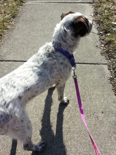 One of the great staff at the Shelter found a collar and leash we could use so E and I walked Puppy to the vet clinic for a check up where the entire staff of the clinic quickly became smitten. He didn’t have mange and the sore on his ear is from fly bites. Ick. Dr. R said a topical antibiotic like neosporin would clear it up and since it looked like he’d be coming home with me, I had him wormed and vaccinated. I nearly said his ‘secret’ name out loud, but I held strong.