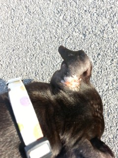 I was out for a walk with one of my current favorites from the shelter recently when I encountered a big surprise. Rapunzel and had stopped briefly for some poochie smoochies when all of a sudden I glanced up to see another dog running toward us. He looked quite happy and sweet, but like with any off leash dog (without a collar) I felt a flash of apprehension. He turned out to be just a dog of the neighborhood, about 5-6 months old and looking for some fun. He was also somewhat dirty, had thin hair and a huge open sore on his ear.