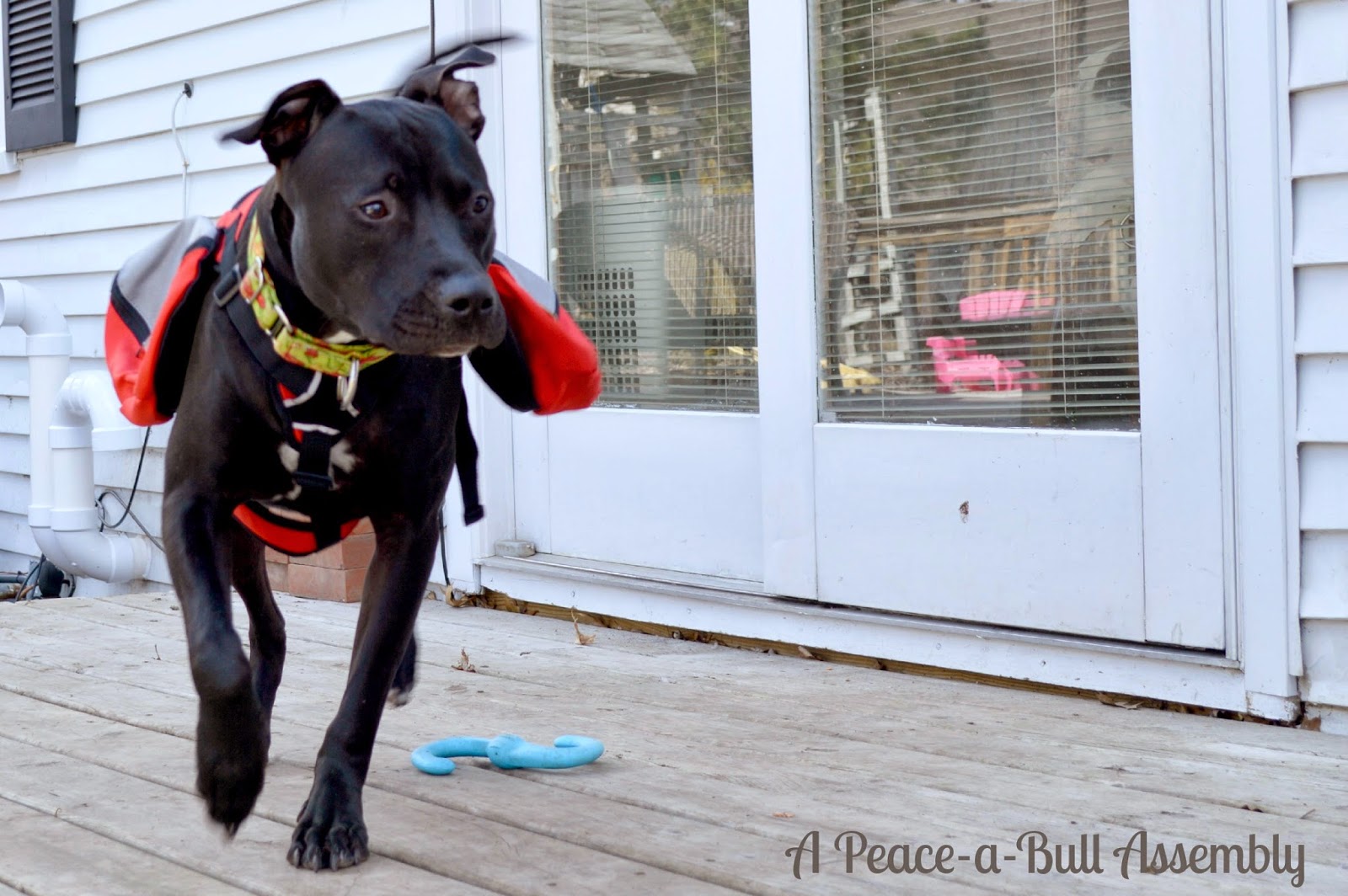 When we got home, Asia put the Peaceabull boys in the house and we let Krispie get acquainted with the yard and when he looked pretty comfortable, we releashed him and brought Julius out on leash. We did a few intros and after just a few short minutes we could tell by their body language that they were going to be great friends. While I knew Julius would be fine, I wondered about Krispie who seemed so tentative at first, but he quickly became Julius’s little shadow. They played and romped both that evening and the next morning before Krispie was returned for what was to be his last day without a forever home and there was even a moment when Julius had to “correct” Krispie which went well.