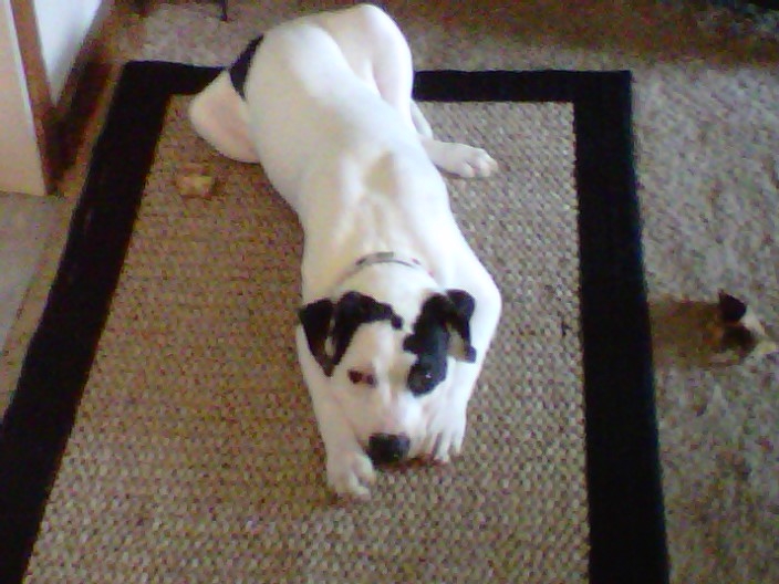 So about these Pit Bulls of mine. I have a kit for Julius’s dna, but haven’t swabbed him yet, so “breed” isn’t much of a consideration in his make up yet. At 9ish months old, he is nearly as tall as Ray, his feet are bigger and rounder, his tail curls up, his face is longer and the angles are softer. His eyes are almond shaped, dark, dark brown and luminous, giving him and Asian look. He seems slower to learn than Ray, but he also learns from Ray. Julius used to scarf down his food, though now he actually takes time to look up from the bowl and chew his kibble so he seems to know breakfast and dinner will be served every day.